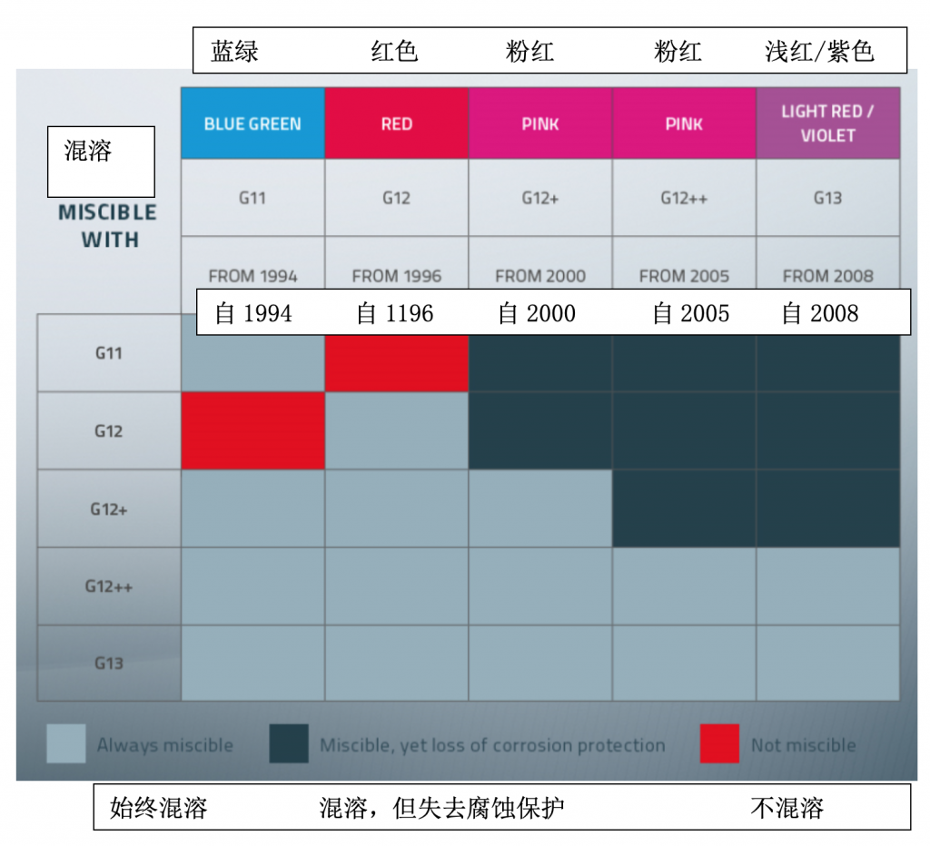 但是,即使无法这样做,您仍然有选择方案。一些类型冷却液是可混溶的(意味着它们可以均匀混合),而有些则不是。请查阅下表,了解可安全混合的类型。Wolf提供G11、G12+和G13专用冷却液。
